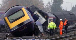 Local media said an off-duty policeman saw the train hit a car on a level crossing near Ufton Nervet, Berkshire. He alerted the emergency services but did not have time to avert the tragedy in which all the eight carriages and two engines of the train left the track and scores of people were injured.