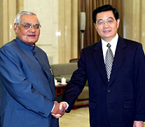 Hu and Vajpayee also exchanged views on the two countries' cooperation in the areas of economy and trade, education, culture, science and technology.