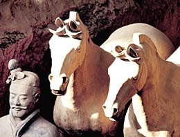 To date, the tomb of the Emperor Qin has not been excavated. But his buried terracotta army unearthed nearby has already stunned the world and has been called the “eighth wonder of the world”. They are the largest pottery figurine group ever unearthed in China. So far, three pits containing such figurines have been excavated. They cover a total area of 20,000 square meters. Some 8,000 life-sized warriors demonstrate a powerful military array under the rule of the First Emperor of the Qin Dynasty, 2,200 years ago.