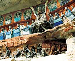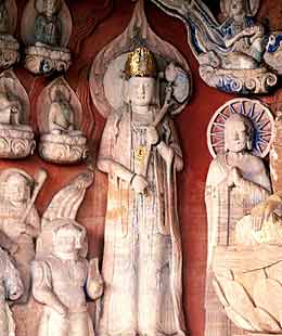 Construction began on the Beishan Hill in the late Tang Dynasty and lasted for more than 250 years, with some 300 niches containing some 10,000 statues of Buddha being carved. The cave bearing the openwork octagonal "soul chariot" which symbolizes the eternal turning of the wheel of Buddhist law is the most fantastic piece of work. Right in the center of the cave is the statue of Sakyamuni, founder of Buddhism, which is flanked by more than 20 statues including the Buddha of wisdom and universal benevolence.