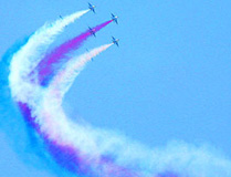 The clear skies over Beijing were painted blue, red and white Wednesday as the Chinese Air Force aerobatics team performed thrilling stunts in their new aircraft.