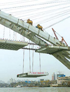 The last piece of steel and cement is lifted into place to complete the surface of the Lupu Bridge over Huangpu River in Shanghai on Friday. With a span of 550-meters it is the world's longest steel arch bridge. It is expected to be open to traffic by the end of June.