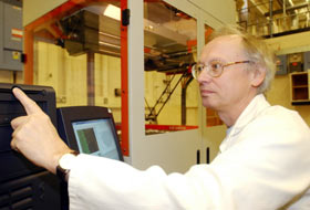 Steve, a technician of Warwick University, operates the robot Diamond 600 picking objects at the Engineering Lab of University in Coventry, Britain, Dec. 18, 2003.
