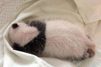 One of the twin cubs born by the American-born female giant panda Hua Mei sleeps in an attemperator at the China Wolong Giant Panda Protection and Research Center in southwest China’s Sichuan Province Sept. 27, 2004.