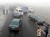Twenty cars in a pile-up caused by heavy fog on the No.102 highway yesterday morning in northeast China's Liaoning Province. No one was injured in the accident.