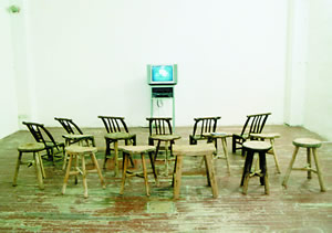 A small room is separated on the left, where stools were placed for viewers of the video work. Scenes of old buildings were presented, with the frames frequently broken by a red or yellow spot skipping up and down the screen. It was a witty work, but not powerful.