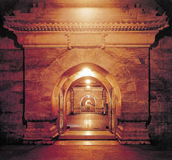 The Underground Palace Halls, a labyrinth palace building, were the first royal tomb excavated in accordance with plan in China. The labyrinth palace building consists of 5 underground halls, i.e. front, middle, back, left and right halls, with the total area 1195 square kilometers. There are seven stone gates in the five halls. The stone gates of the front, middle and back halls were most finely done with sculptured white marble. Every stone gate has two leaves, each of which is 3.3 m high and 1.8 m broad and weighs about 4 tons. On every facade of leaf, 81 nipple like nails and decorative beast head holding knocker in the mouth are sculptured. The back hall, the biggest one in the underground palace, is also called labyrinth room, which is the main part of the Underground Palace. It is 9.5 m high, 9.1 m broad and 30.1 m long, paved with polished piebald stones. On the front of the coffin platform, inner and outer coffins are laid with the Emperor Zhuyijun in the middle and two Queens, Xiaoduan and Xiaojing on two sides respectively.