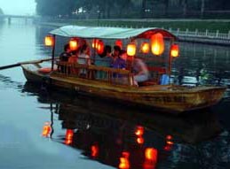 Residents take a leisure of tea and bamboo flute in a boat on the Kunyu River in the rain in Beijing June 8.