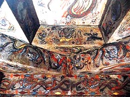 Some of the earlier murals portray palaces, water wells, soldiers, maids, cattle and dogs, flowers and grasses and the sun and the moon.
