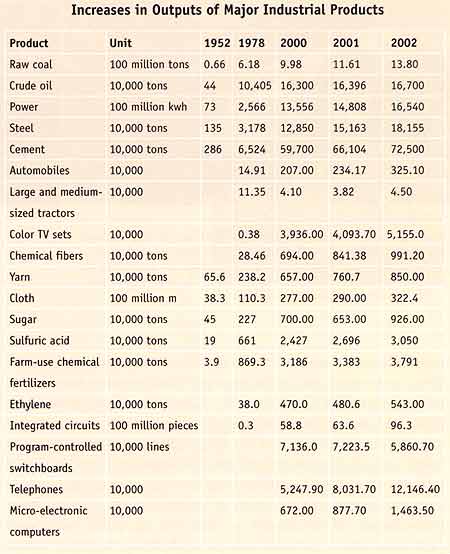 In the latter half of the 20th century, especially in the two decades after the initiation of reform and opening to the outside world, China's industry has developed rapidly. Between 1979 and 2000, the average annual growth rate of industrial increments reached 11.6 percent, as calculated in constant prices. In 2002 the combined assets of all the state and non-state industrial enterprises with annual product sales income topping five million yuan amounted to 14,479.1 billion yuan, and the nation's industrial added value came to 4,593.5 billion yuan, an increase of 10.2 percent over that of the previous year.