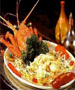 700 g de crevettes géantes, 30 g d'épinéphélé, 30 g d'algue, 30 g d'escargots tranchés, 15 g d'ail haché, 1 g de glutamate de sodium, 1 g de poivre, 100 g d'huile, 5 g de sucre, 5 g de vin jaune de cuisine, 5 g d'huile de sésame, 5 g de moutarde japonaise, 3 g de sel, 10 g de gingembre haché et 10 g de sauce de soja.