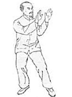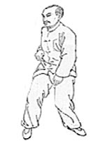 Fl?chir les genoux pour s?accroupir ? demi, d?placer le centre de gravit? sur la jambe droite, soulever le talon gauche et le mettre pr?s de la cheville du pied droit ; en m?me temps, fermer les poings, les lever et les mettre ? c?t? de la taille, le creux de poing vers le haut, regarder vers l?avant ? gauche.