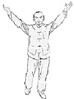 Position de d?part : Se tenir debout avec les pieds ?cart?s d?une largeur ?gale ? celle des ?paules, les bras pendants ; se d?tendre compl?tement ; r?gulariser la respiration ; concentrer