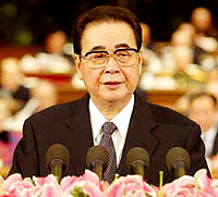 Li Peng, pr?sident du Comit? permanent de l'Assembl?e populaire nationale (APN, Parlement) de Chine, pr?sente un rapport d'activit? du Comit? permanent de la IXe APN, lors de la troisi?me s?ance pl?ni?re de la premi?re session de la Xe APN tenue lundi matin ? Beijing.