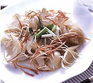 2. Faire cuire les lamelles du bulbe de lis d ans de l'eau bouillante, les repêcher, les égoutter et les mettre dans un récipient. Ajouter les filaments de jambon et de poulet, du sel, du poivre et de l'essence de poulet, mélanger le tout.