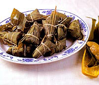 de riz ou de millet glutineux, enveloppés de feuilles de roseau ou d'autres plantes. Selon des documents historiques, cet aliment est apparu pendant la période des Royaumes Combattants. Avec le temps, ses variétés se sont multipliées, par exemple le gateau de jujubes, de purée d'haricots rouges, de jaune d'?uf, de jambon ou farci de porc. Dès le début du 5e mois lunaire de chaque année, beaucoup de familles commencent à faire tremper du riz glutineux dans l'eau, laver des feuilles de roseau et faire des gateaux triangulaires. Dans les magasins de produits alimentaires, on peut trouver davantage de variétés de gateaux. La coutume chinoise de manger des gateaux triangulaires de riz glutineux s'est répandue en Corée , au Japon et dans d'autres pays d'Asie du Sud-Est.