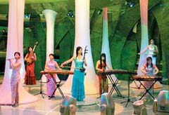 寫真:中國館の開館初日、メーンオブジェ「いのちの樹」の間で演奏する中國民族音楽の女性バンド