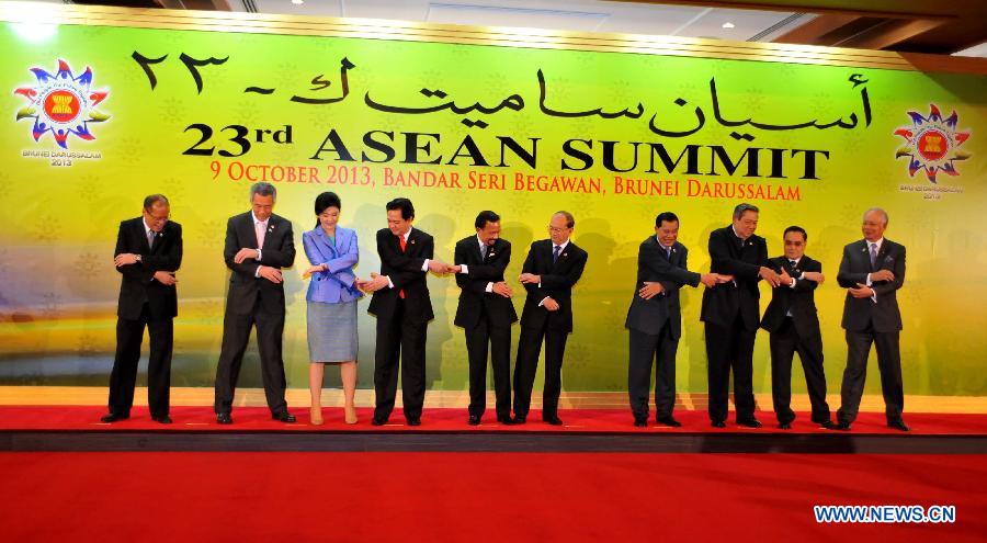 ASEAN leaders pose for a group photo in Bandar Seri Begawan, capital of Brunei Darussalam, Oct. 9, 2013. The 23rd ASEAN summit opened here Wednesday morning. [Zhao Yusi/Xinhua]