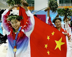 В только что закончившихся соревнованиях по синхронным прыжкам в воду с 3-метрового трамплина победили китайские спортсменки Го Цзинцзин и У Минься. Они выиграли еще одну золотую медаль для нашей команды на Олимпиаде в Афинах.