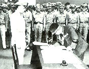 Японский представитель Умедзу подписывает Акт о безоговорочной капитуляции Японии на борту линкора ?Миссури?, Токийская бухта