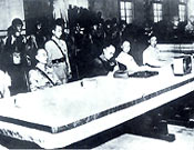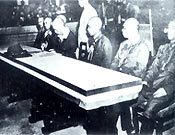 Генерал Хэ Инцинь расписывается на подписанном японским представителем Акте о капитуляции Японии