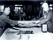 От имени Японии Ясудзи передает Акт о капитуляции генералу Хэ Инциню