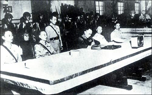 Генерал Хэ Инцинь расписывается на подписанном японским представителем Акте о капитуляции Японии.
