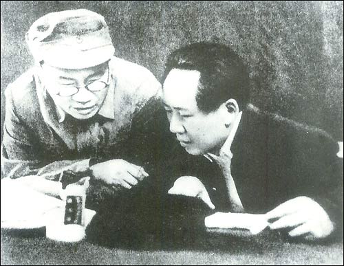 Председатель ЦК КПК Мао Цзэдун и командующий 18-й сводной армией Чжу Дэ изучают план контрнаступления.