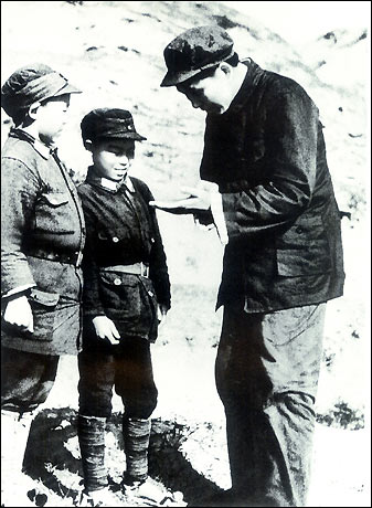 Мао Цзэдун беседует с двумя маленькими солдатами 8-й армии.