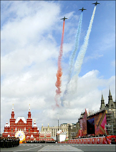 Сегодня в 10:00 часов по местному времени (в 14:00 часов по пекинскому) на Красной площади в Москве начался военный парад в честь 60-летия Победы в Великой отечественной войне. Президент России Владимир Путин, председатель КНР Ху Цзиньтао, президент США Джордж Буш, генеральный секретарь ООН Кофи Аннан, руководители более 50 стран мира, представители международных организаций, ветераны и тысячи представителей различных кругов России принимают участие в сегодняшних торжествах.