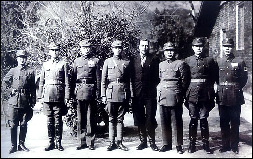 В феврале 1939 года Военный совет китайского правительства открыл в провинции Хунань курсы для кадровых работников. На снимке: советский советник Дивинов с руководителями курсов. Справа налево: Цай Цзяньминь, Е Цзяньин (зам. зав. учебной частью, коммунист), Тан Эньбо (зав. учебной частью, член партии Гоминьдан), Дивинов.