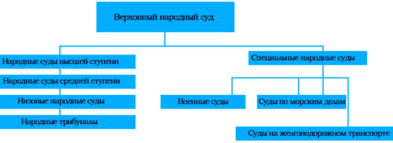 В соответствии с положениями действующей Конституции и Закона КНР об организации народных судов, народные суды – это органы судопроизводства. Система народных судов включает в себя местные народные суды различных ступеней, специальные народные суды и Верховный народный суд. Судебная деятельность местных народных судов различных ступеней в целом находится под надзором Верховного народного суда. Местные народные суды различных ступеней учреждаются в соответствии с административно-территориальным делением, специальные суды учреждаются в соответствии с принципом потребности.