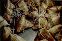 В праздник Дуаньу принято кушать “цзунцзы” – приготавливаемое на пару кушанье из клейкого риса, обернутое тростниковыми, бамбуковыми или пальмовыми листьями и перевязанное разноцветными шелковыми нитями.