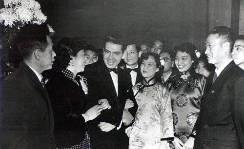 Заслуженный артист РСФСР А.Райкин среди артистов труппы Шанхайского театра музыкальной драмы в Центральном доме работников искусств. Москва, 1956 г.