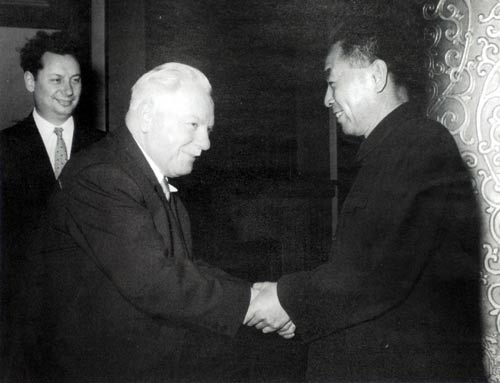 Встреча Чжоу Эньлая с Председателем Президиума Верховного Совета К. Е. Ворошиловым, находящимся в Пекине с визитом. Пекин, апрель 1957 г.