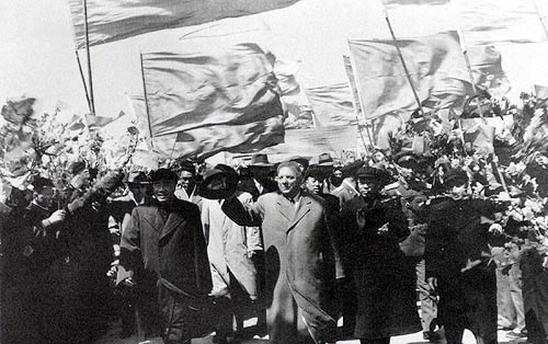 Чжу Дэ сопровождает Председателя Президиума Верховного Совета СССР К.Е.Ворошилова в поездке в г. Аньшань. Аньшань, апрель 1957 г.