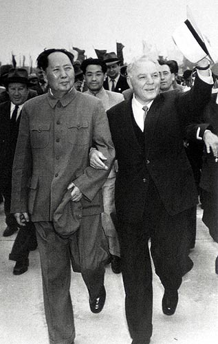 Председатель Центрального Народного Правительства КНР Мао Цзэдун, Председатель Президиума СССР К. Е Ворошилов на аэродроме ?Наньюань? во время отьезда советской правительственной делегации на родину. Пекин, май 1957 г.