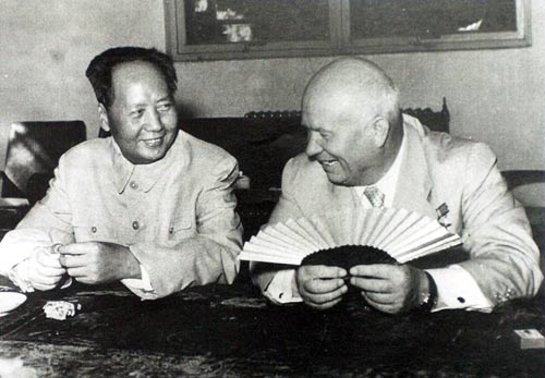 Первый секретарь ЦК КПСС Н. С. Хрущев за дружеской беседой с Председателем Народного Правительства КНР Мао Цзэдуном в комнате ожидания Пекинского аэропорта. Пекин, август 1958 г.
