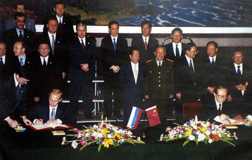 Председатель КНР Цзян Цзэминь и президент РФ В. Путин подписывают китайско-российскую Пекинскую декларацию. Пекин, июля 2000 г.