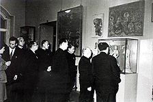 Заслуженный артист РСФСР А.Райкин среди артистов труппы Шанхайского театра музыкальной драмы в Центральном доме работников искусств.