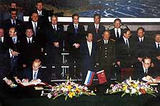 Председатель КНР Цзян Цзэминь и президент РФ В. Путин подписывают китайско-российскую Пекинскую декларацию.