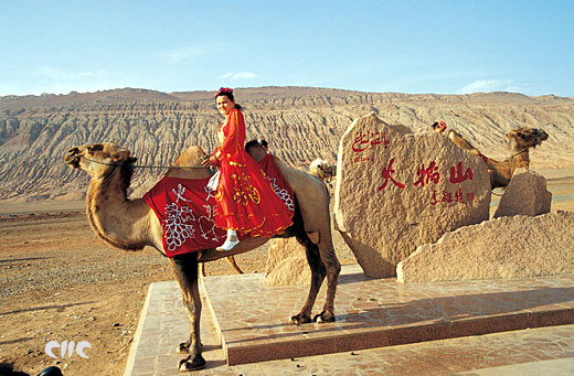 Уйгурская девушка перед горой Хояньшань в Турфане