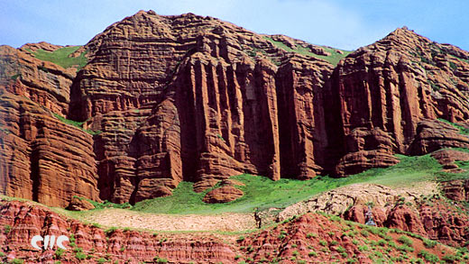 Pintura sobre la reproducción en un precipicio jurásico de arenisca de las monta?as Tianshan